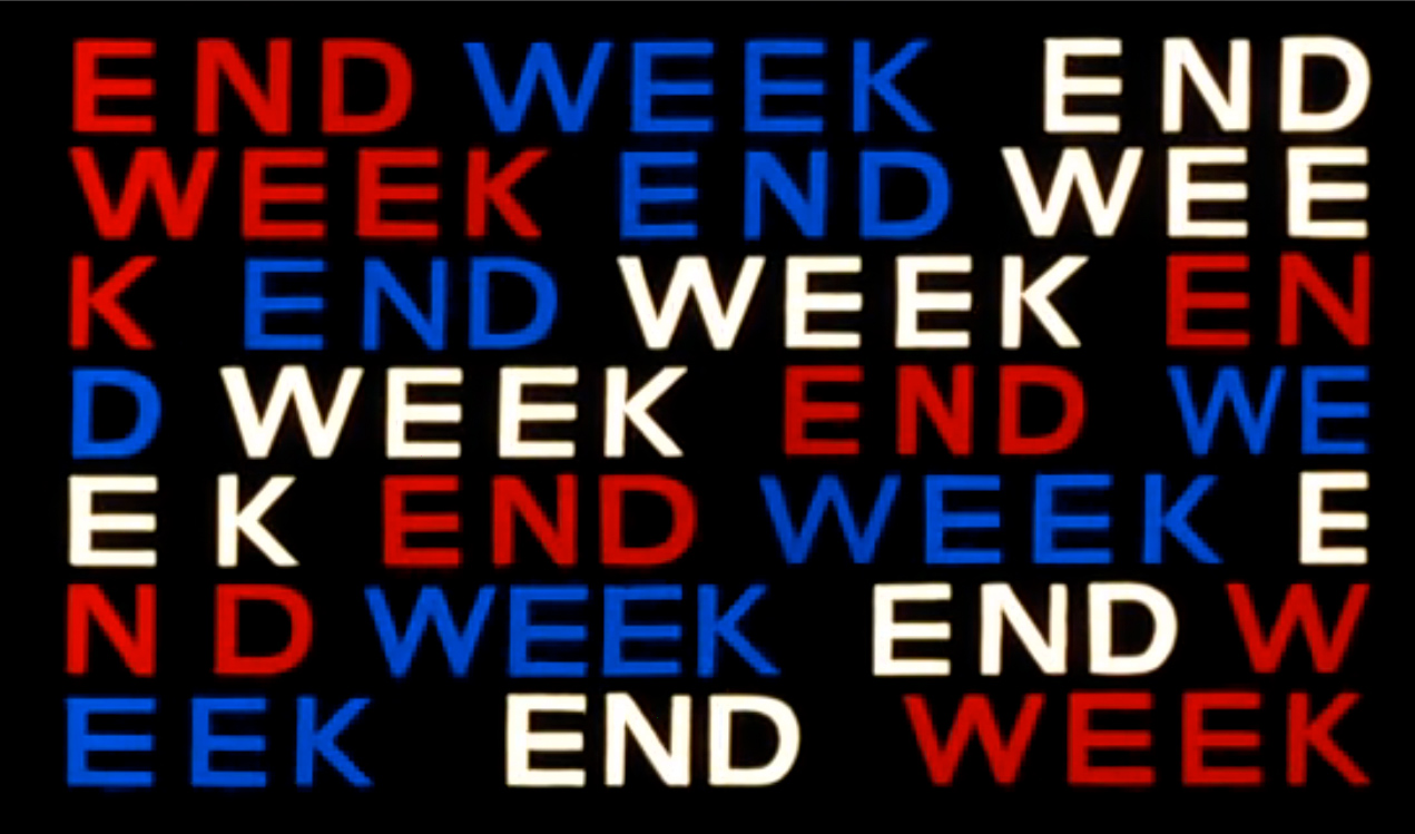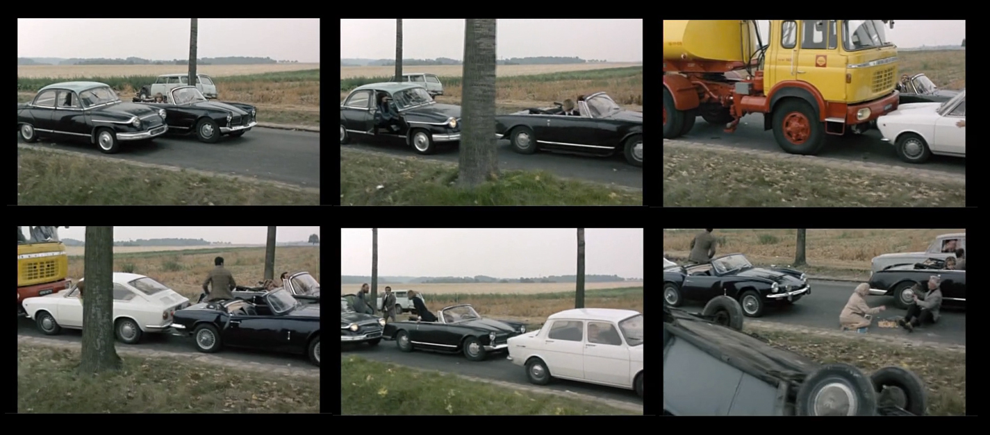 By the late 1960’s Godard was becoming increasingly experimental with the cinematic form. Weekend shows a notable shift away from traditional narrative process, instead we’re made brutally aware of the instructive possibility of film over entertainment. The traffic jam sequence, like the film as a whole, contrives to break the fourth wall. Rather than utilising his famed jump cuts, Godard flashes two title cards to break our involvement with the narrative. The first card, the film’s title Weekend, quite literally reminds us that we’re watching a film, while the second ‘13h40’ emphasises the length of this protracted traffic jam. The tracking shot in itself is so audacious and over exposed that it draws attention to itself by simply being. These jarring excursions back to reality remind us, the audience, that Godard’s political message and content isn’t isolated to film but must be extended to reality.